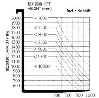 | Die Verringerung der Belastung bei 6000 mm ist auf der Grundlage des Standardlastzentrums sicherzustellen, außerdem wird die Lastkapazität bei höherem Aufzug | ||||